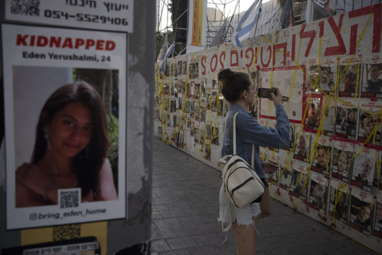 Stena s fotografiami rukojemníkov zadržiavaných v pásme Gazy. Foto: SITA/AP