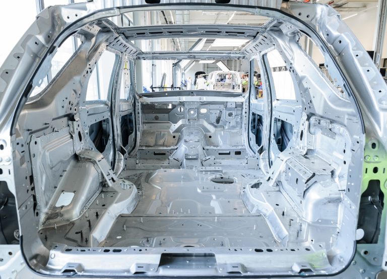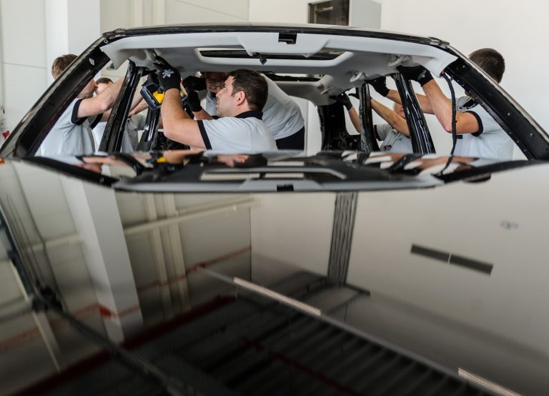 Karoséria vozidla pripravená na kontrolu kvality počas prehliadky novootvorenej Tréningovej akadémie pri príležitosti stretnutia médií s predstaviteľmi spoločnosti Jaguar Land Rover. Nitra, 29. máj 2018. Foto: SITA/Martin Havran
