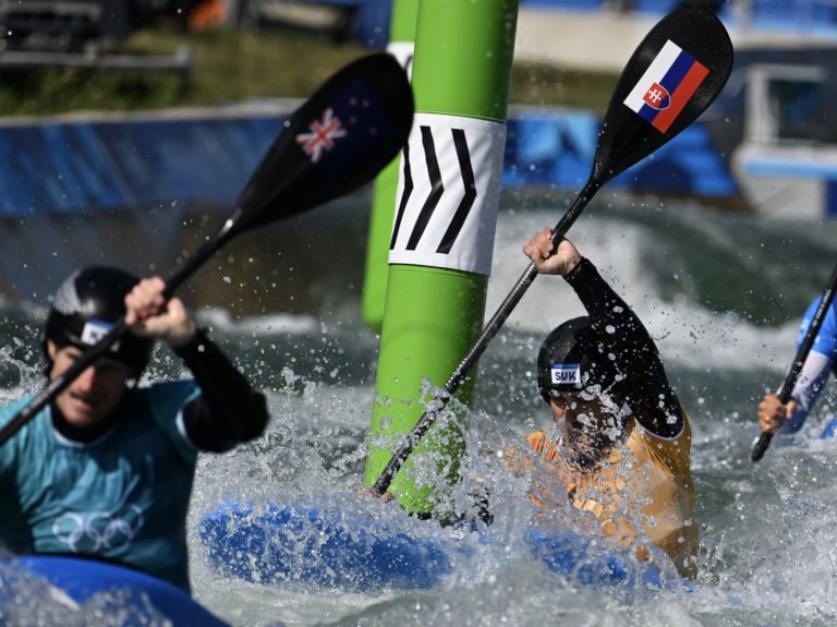 Slovenský kajakár Jakub Grigar (vpravo) počas semifinále v kajak krose mužov v rámci XXXIII. letných olympijských hier 2024 v Paríži. Paríž, 5. august 2024. Foto: SITA/Martin Medňanský