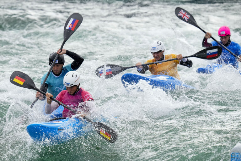 Nemec Noah Hegge (druhý zľava) v mužskom kajak krose proti Slovákovi Jakubovi Grigarovi (vľavo), Britovi Adamovi Burgessovi (vpravo) a Slovincovi Petrovi Kauzerovi na Letných olympijských hrách 2024. Foto: SITA/AP