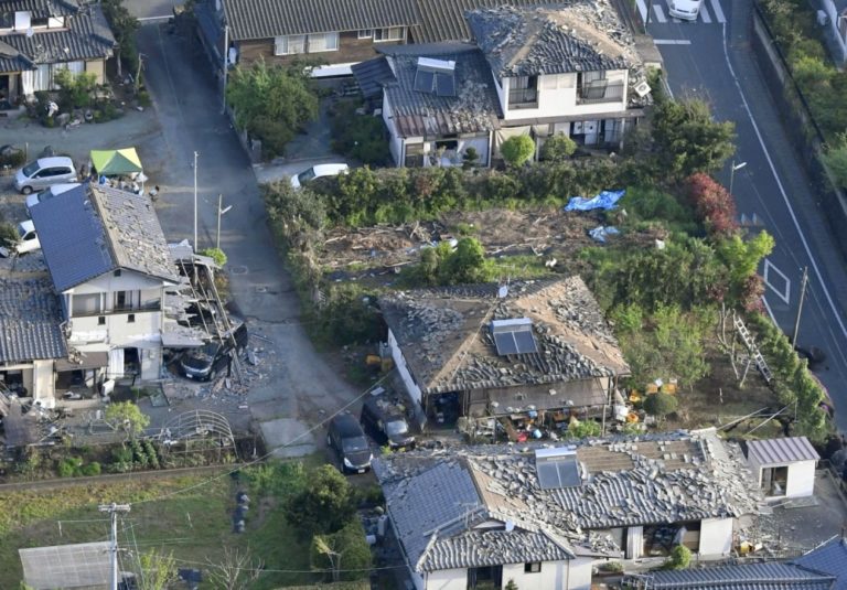 Na najmenej deväť stúpol počet obetí štvrtkového zemetrasenia s magnitúdou 6,5, ktoré postihlo najjužnejší z hlavných japonských ostrovov Kjúšu. Viac ako 950 ľudí utrpelo v dôsledku otrasov zranenia, vyše 50 vážne. Približne 44 000 ľudí muselo byť evakuovaných. Po hlavnom otrase, ktorý nastal o 21.26 h miestneho času (14.26 h SELČ), nasledovali desiatky citeľných dotrasov. Hypocentrum zemetrasenia ležalo v hĺbke desať kilometrov pod povrchom v oblasti mesta Kumamoto. (14. apríl 2016.) Foto: Shingo Nishizume/Kyodo News via AP