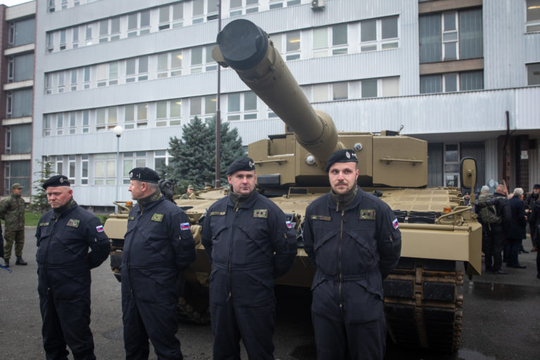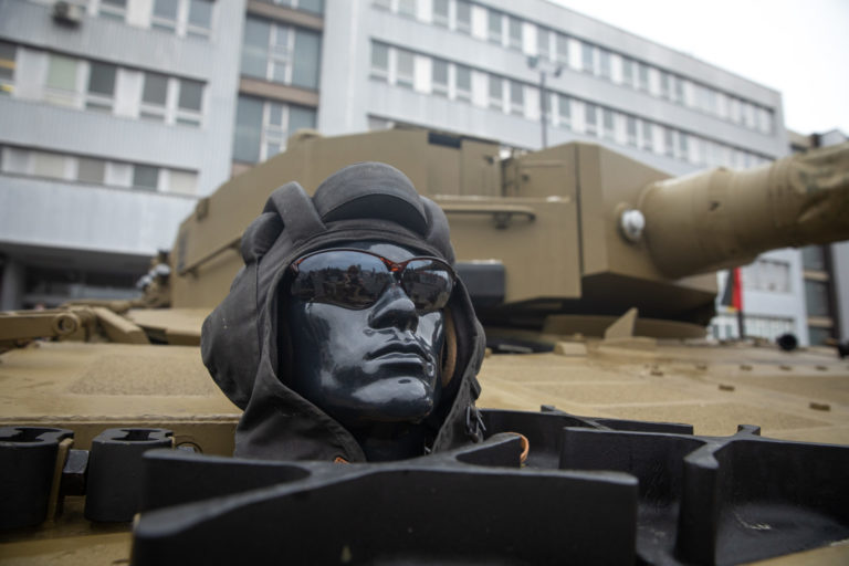 Tank Leopard 2A4 a jeho posádka počas prehliadky vojenskej techniky po prijatí ministerky obrany Nemecka ministrom obrany SR s plnými poctami na Ministerstve obrany SR. Bratislava, 19. december 2022. Foto: SITA/Diana Černáková.