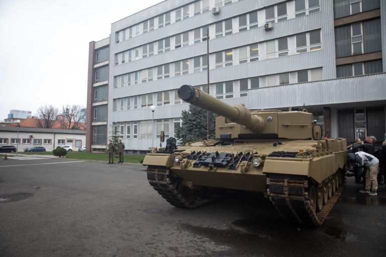 Tank Leopard 2A4 počas prehliadky vojenskej techniky po prijatí ministerky obrany Nemecka ministrom obrany SR s plnými poctami na Ministerstve obrany SR. Bratislava, 19. december 2022. Foto: SITA/Diana Černáková.