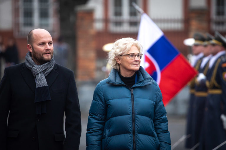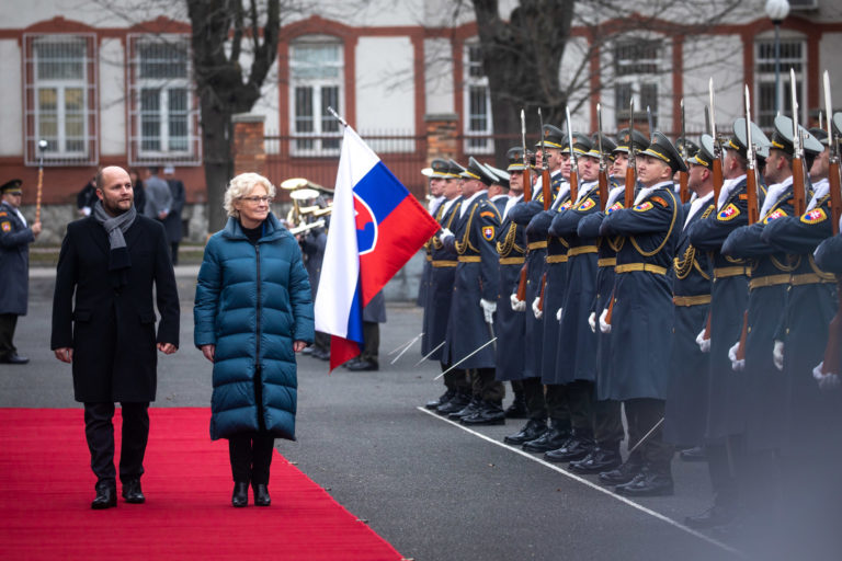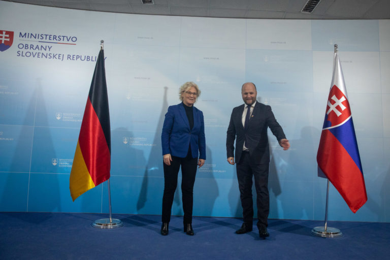 Zľava: Minister obrany Jaroslav Naď a Nemecká ministerka obrany Christine Lambrechtová počas privítania ministerky obrany Nemecka s plnými poctami, prehliadky vojenskej techniky a odovzdania symbolického klúča od tanku Leopard 2A4 na Ministerstve obrany SR. Bratislava, 19. december 2022. Foto: SITA/Diana Černáková.
