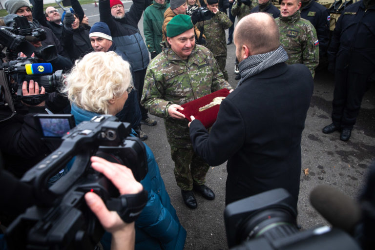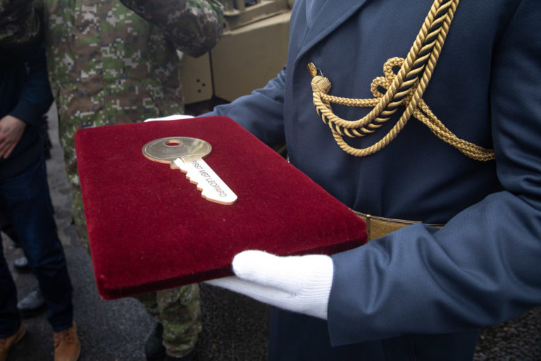 Odovzdanie symbolického klúča od tanku Leopard 2A4 za účsti ministrov obrany Slovenska a Nemecka na Ministerstve obrany SR. Bratislava, 19. december 2022. Foto: SITA/Diana Černáková.