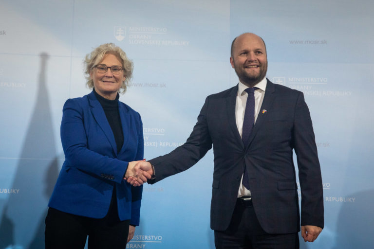 Sprava: Minister obrany Jaroslav Naď a nemecká ministerka obrany Christine Lambrechtová počas prijatia ministerky obrany Nemecka ministrom obrany SR s plnými poctami na Ministerstve obrany SR. Bratislava, 19. december 2022. Foto: SITA/Diana Černáková.