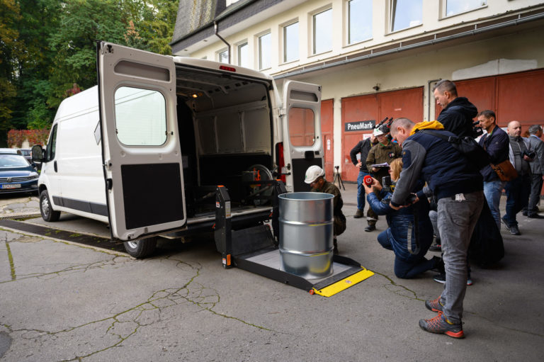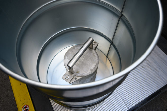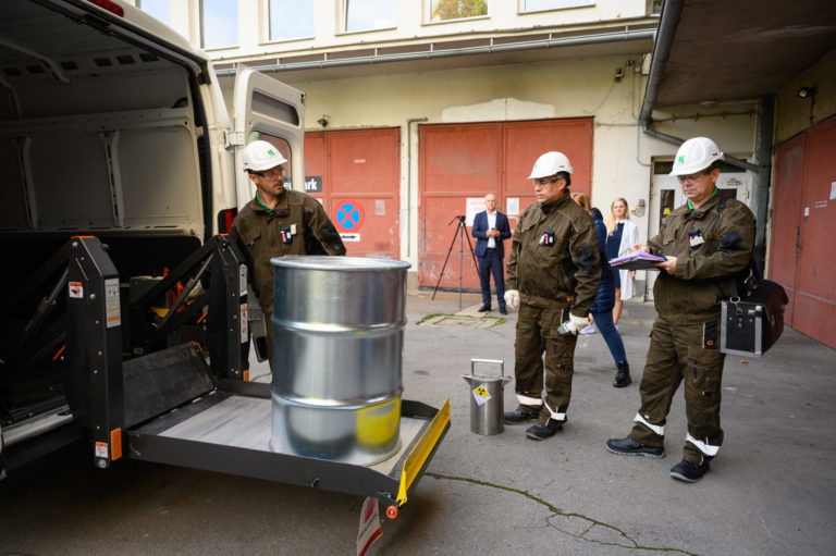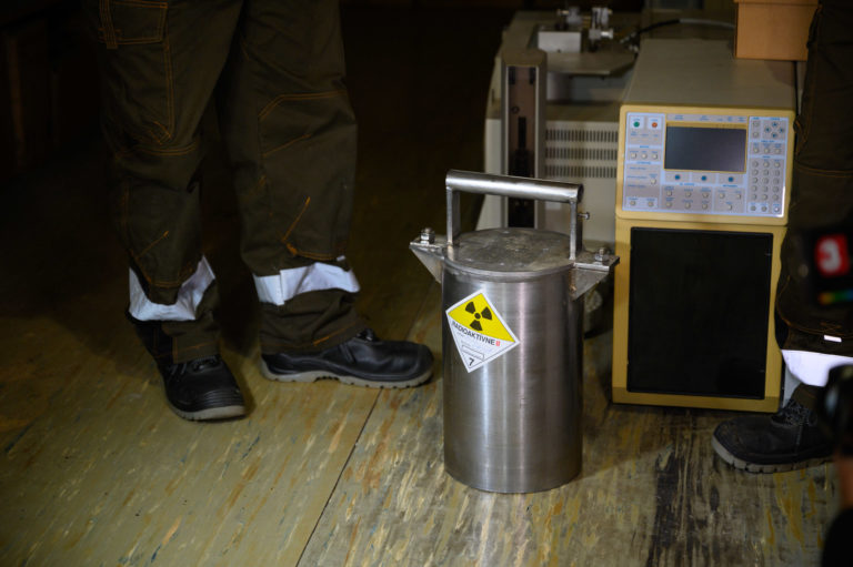 Kontajner s rádioaktívnym materiálom uložený do sudu na prevoz počas preberania historického rádioaktívneho odpadu z depozitu Úradu verejného zdravotníctva. 5. október 2022. Foto: SITA/Milo Fabian