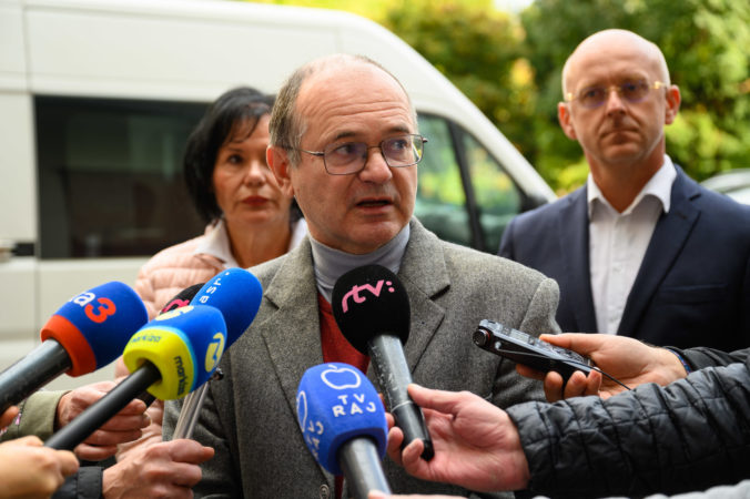 Generálny riaditeľ štátnej spoločnosti JAVYS Pavol Štuller (v popredí) počas brífingu pri príležitosti preberania historického rádioaktívneho odpadu z depozitu Úradu verejného zdravotníctva v Žiline spoločnosťou JAVYS. Žilina, 5. október 2022. Foto: SITA/Milo Fabian