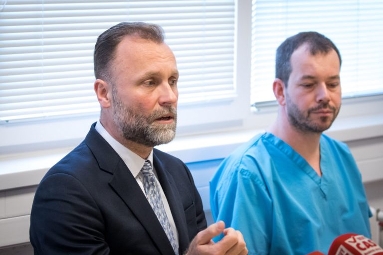 Generálny riaditeľ NÚDCH Ladislav Kužela (vľavo) počas tlačovej konferencie pred otvorením jednotky intenzívnej a operačnej starostlivosti na Neonatologickej klinike intenzívnej medicíny (NKIM) Národného ústavu detských chorôb. Bratislava, 18. január 2018. Foto: SITA/Diana Černáková