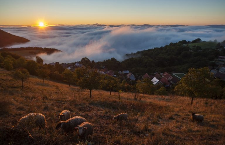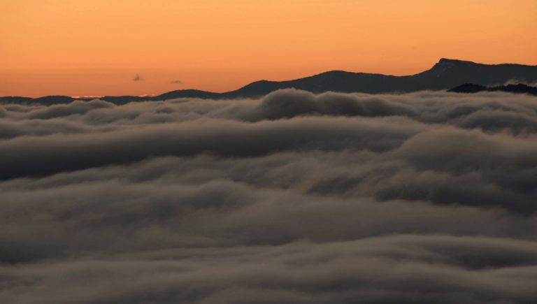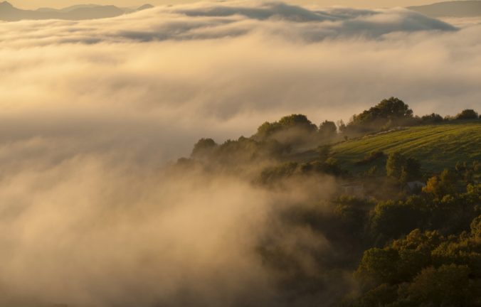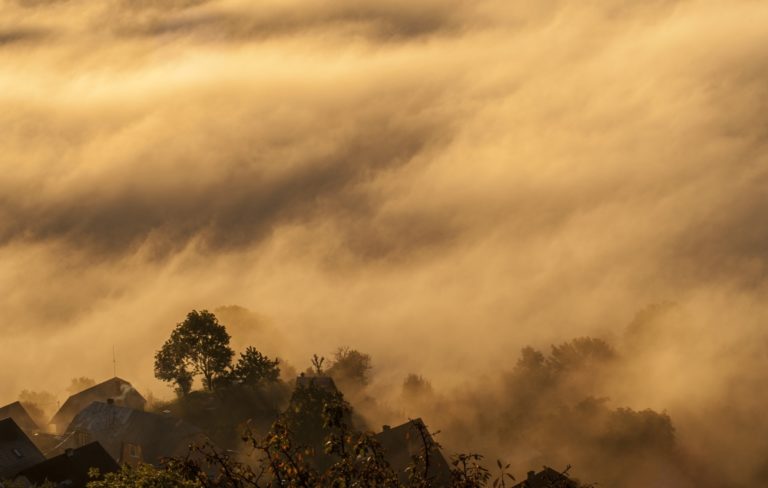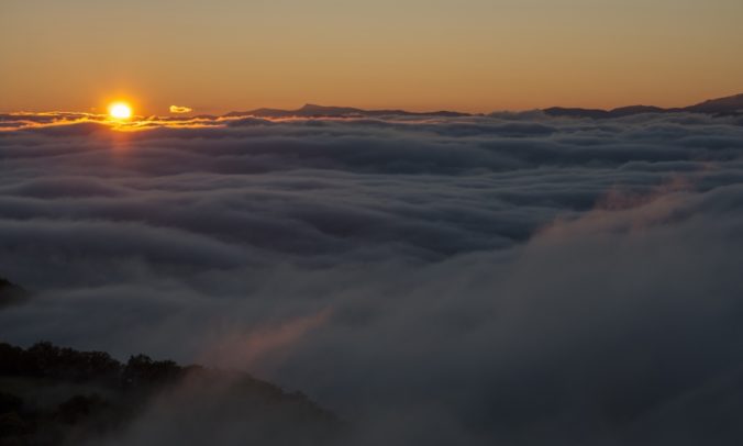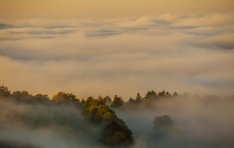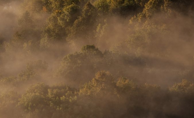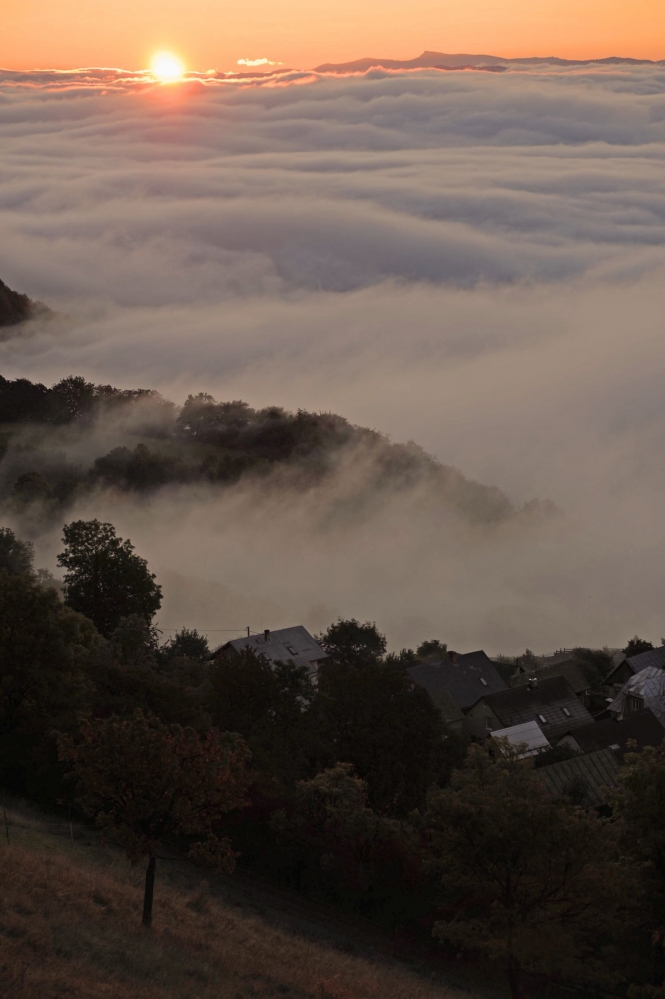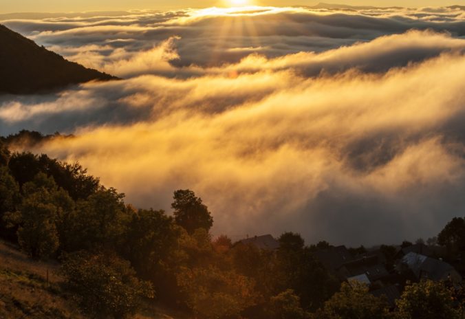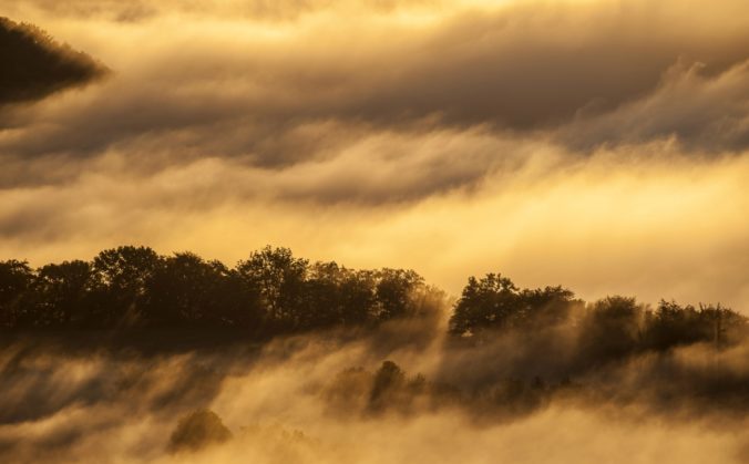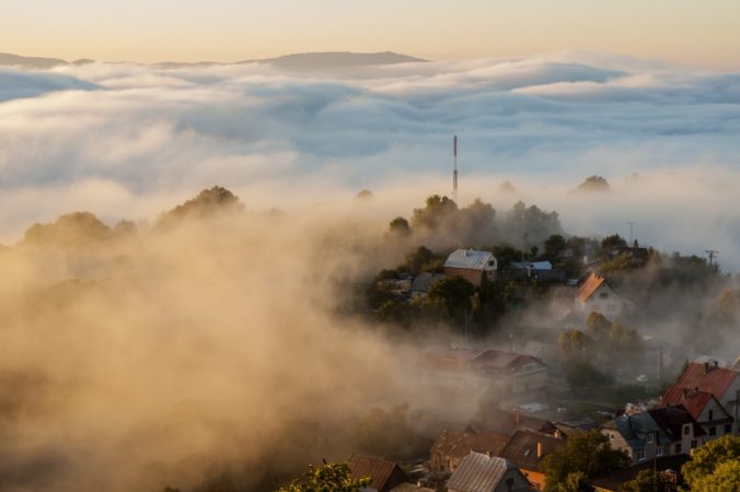 Jesenné počasie a s ním spojené hmly a inverzná oblačnosť v pohorí Biele Karpaty nad dedinou Vršatské Podhradie v okrese Ilava. Vršatské Podhradie, 18. október 2016. Foto: SITA/Tomáš Somr