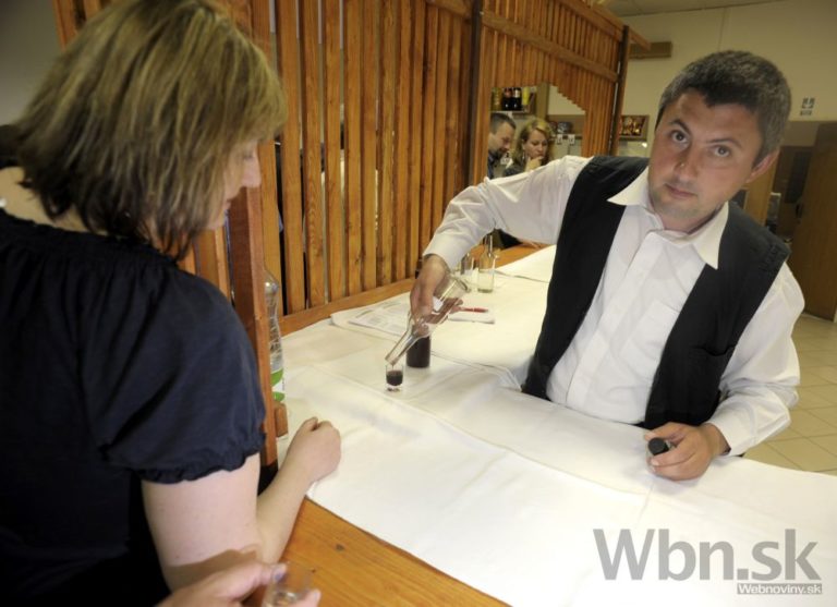 Víťaz v kategórii destilátov slivky Miroslav Hučko zo Starej Myjavy počas jubilejného 20. ročníka podujatia Koštovka páleného na Myjave s viac ako 500 vzorkami destilátov, ktorý sa konal v Dome Kultúry Samka Dudíka. Myjava, 10. máj 2014. Foto: SITA/Martin Medňanský