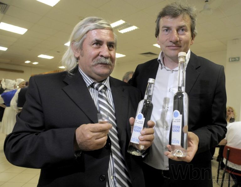 Zľava: Štefan Dulík, víťaz v kategórii destilátov durandie a Peter Bunčiak, spoluorganizátor jubilejného 20. ročníka podujatia Koštovka páleného na Myjave s viac ako 500 vzorkami destilátov, ktorý sa konal v Dome Kultúry Samka Dudíka. Myjava, 10. máj 2014. Foto: SITA/Martin Medňanský