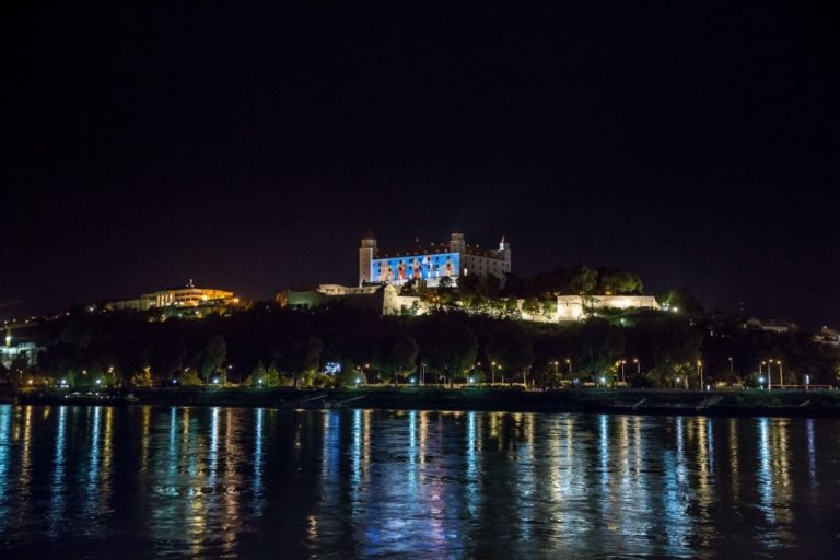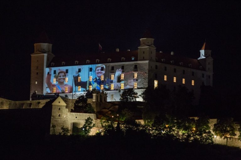 Pohľad na nasvietený Bratislavský hrad pri príležitosti odovzdania predsedníctva v Rade Európskej únie Slovenskej republike z rúk holandského partnera. Bratislava, 30. jún 2016. Foto: SITA/Marko Erd