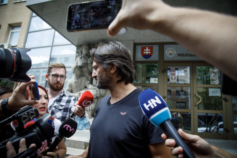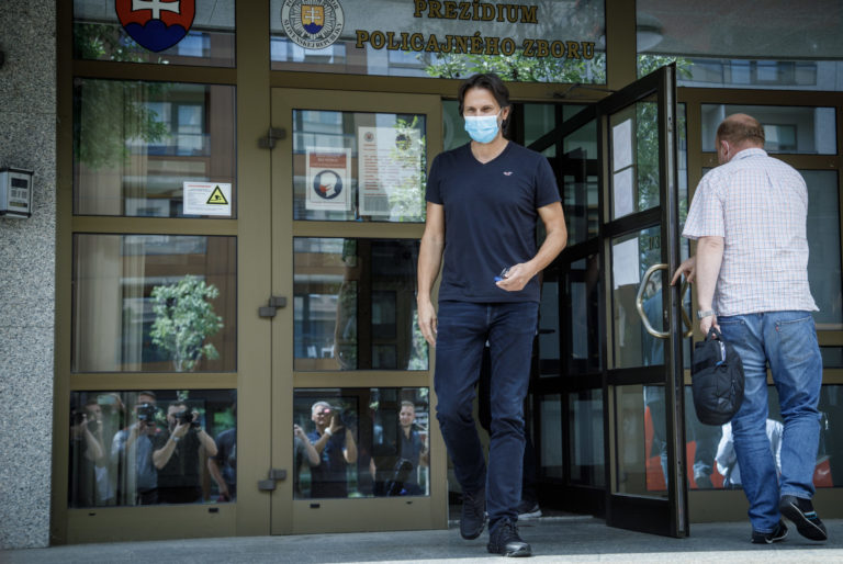 Bývalý minister vnútra SR Robert Kaliňák (v pozadí) odchádza z Národnej kriminálnej agentúry (NAKA) po jeho výsluchu v postavení svedka v kauze Očistec. Bratislava, 19. august 2021. Foto: SITA/Branislav Bibel