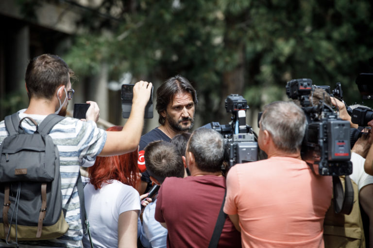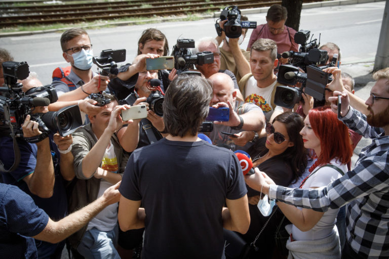 Bývalý minister vnútra SR Robert Kaliňák (uprostred v popredí) odchádza z Národnej kriminálnej agentúry (NAKA) po jeho výsluchu v postavení svedka v kauze Očistec. Bratislava, 19. august 2021. Foto: SITA/Branislav Bibel