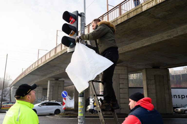 Protestujúci autodopravcovia zakrývajú semafor na križovatke na ceste zo Žiliny v smere do Martina na Košickej ulici, kde vytvorili blokádu v rámci pokračujúceho štrajku zástupcov Únie autodopravcov Slovenska (UNAS) proti daňovému zaťaženiu. Žilina, 10. január 2020. Foto: SITA/Milo Fabian