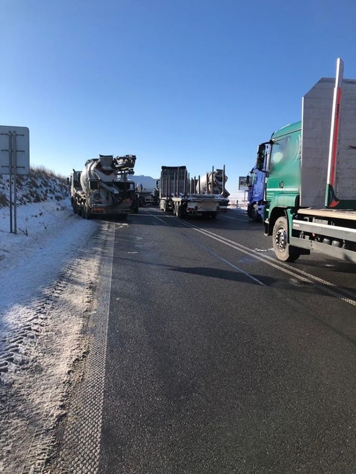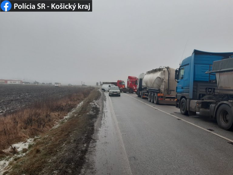 Pohľad na kamióny blokujúce cestu z Košíc v smere do Maďarska v rámci pokračujúceho štrajku zástupcov Únie autodopravcov Slovenska (UNAS) proti daňovému zaťaženiu, ktorý podporili tiež zástupcovia Iniciatívy poľnohospodárov. Košice, 9. január 2020. Foto: SITA/Ivan Fleischer