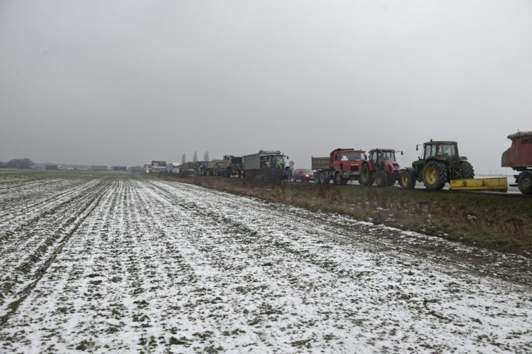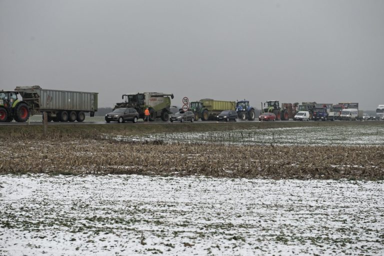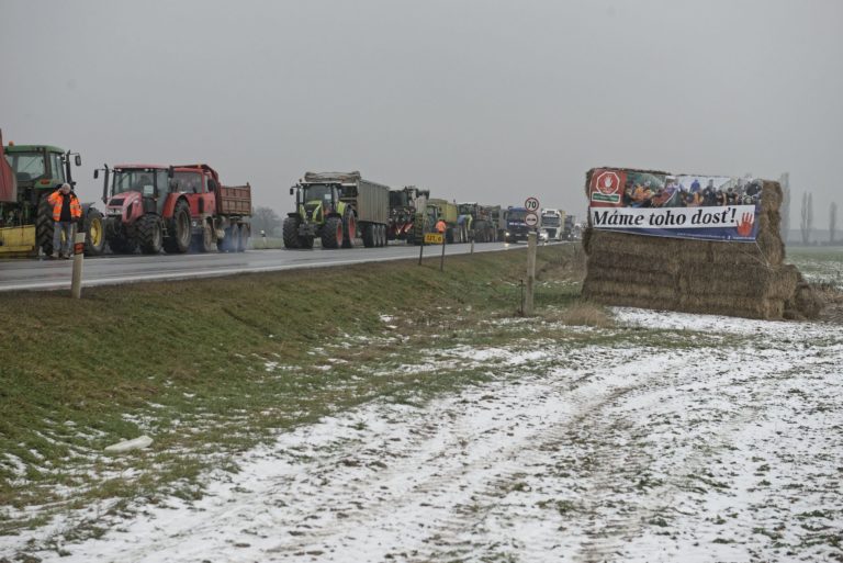 Pohľad na kamióny a traktory blokujúce cestu z Košíc v smere do Maďarska v rámci pokračujúceho štrajku zástupcov Únie autodopravcov Slovenska (UNAS) proti daňovému zaťaženiu, ktorý podporili tiež zástupcovia Iniciatívy poľnohospodárov. Košice, 9. január 2020. Foto: SITA/Ivan Fleischer