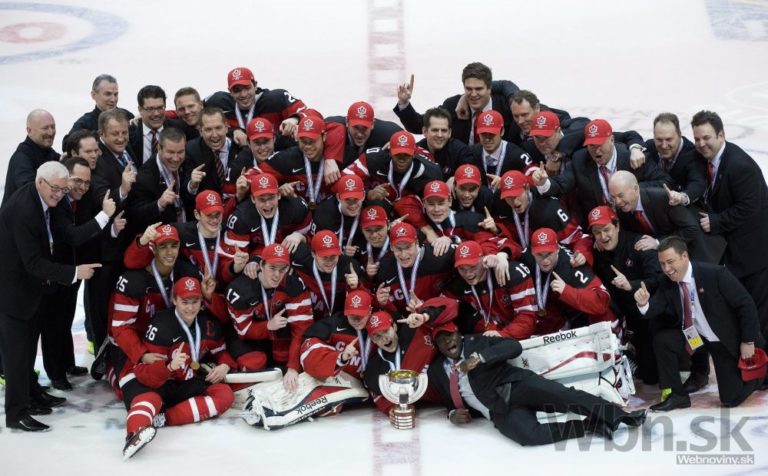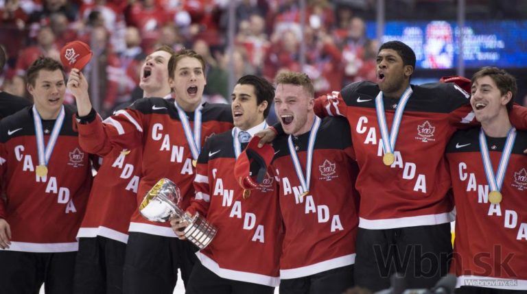 Kanaďania oslavujú získané medaily v dueli o zlato s Ruskom, ktoré zdolali 5:4 na svetovom hokejovom šampionáte do 20 rokov v Toronte, 5. Jan., 2014. Foto: SITA/AP