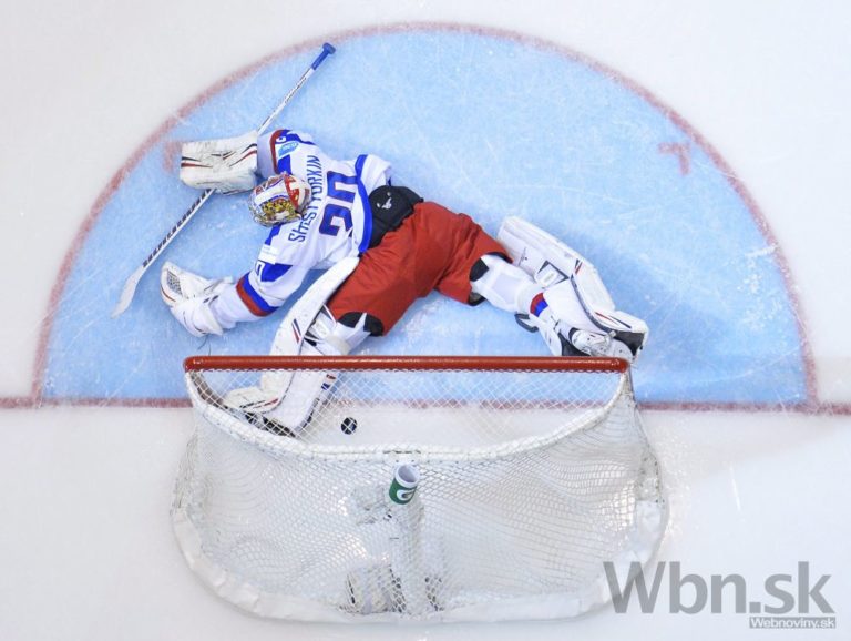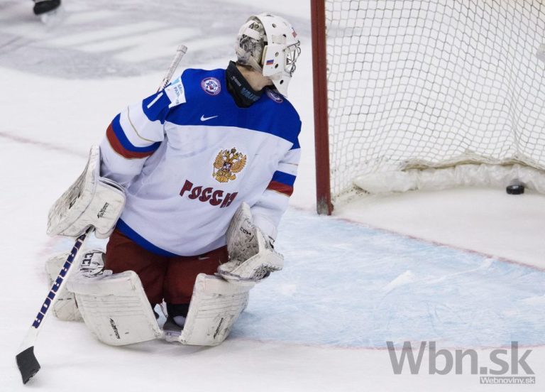 Ruský brankár Ilya Sorokin je prekvapený z puku v bránke. Hokejové majstrovstvá sveta do 20 rokov, Toronto, 5. Jan., 2014. Foto: SITA/AP