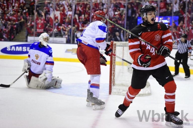 Kanadský hráč Sam Reinhart sa teší z gólu, ktorý počas druhej tretiny strelil do bránky ruského gólmana Sorokina. Hokejové majstrovstvá sveta do 20 rokov, Toronto, 5. Jan., 2014. Foto: SITA/AP