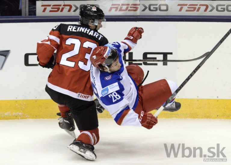 Rus Sergei Tolčinski skončil po zásahu Sama Reinharta počas prvej tretiny na ľade. Hokejové majstrovstvá sveta do 20 rokov, Toronto, 5. Jan., 2014. Foto: SITA/AP