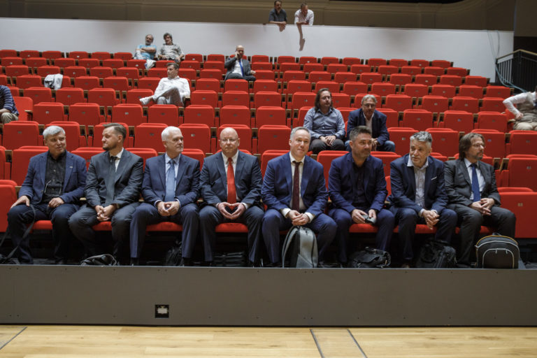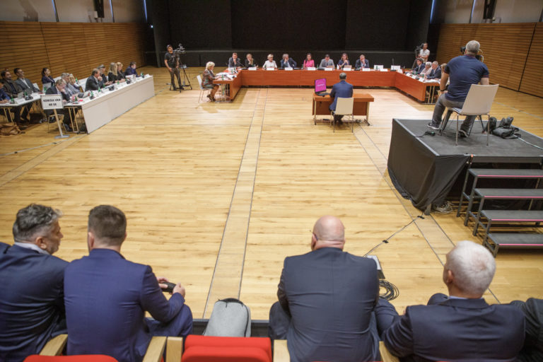 Atmosféra počas verejného vypočutia kandidátov na funkciu generálneho riaditeľa Rozhlasu a televízie Slovenska (RTVS) v rámci schôdze Výboru NR SR pre kultúru a médiá v Zimnej jazdiarni Bratislavského hradu. Foto: SITA/Branislav Bibel