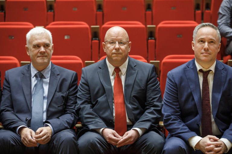 Zľava: Kandidáti Ivan Golian, Jaroslav Rezník, a Daniel Živica počas verejného vypočutia kandidátov na funkciu generálneho riaditeľa Rozhlasu a televízie Slovenska (RTVS) v rámci schôdze Výboru NR SR pre kultúru a médiá v Zimnej jazdiarni Bratislavského hradu. Foto: SITA/Branislav Bibel