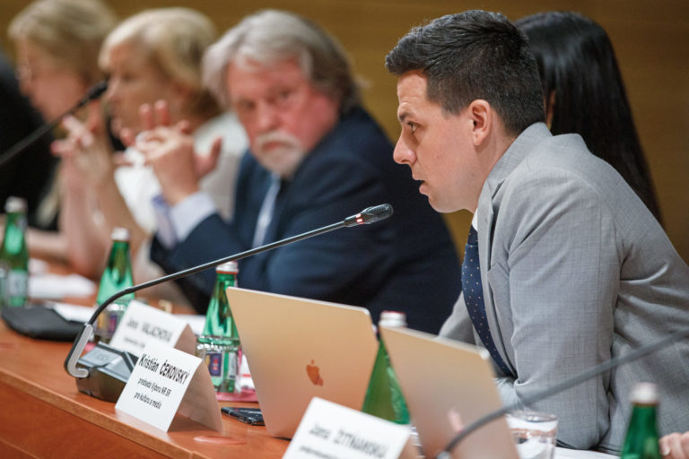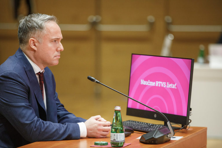 Kandidát Peter Janků počas verejného vypočutia kandidátov na funkciu generálneho riaditeľa Rozhlasu a televízie Slovenska (RTVS) v rámci schôdze Výboru NR SR pre kultúru a médiá v Zimnej jazdiarni Bratislavského hradu. Foto: SITA/Branislav Bibel