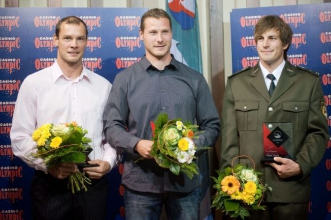 Víťazmi hlavných kategórií v ankete Kanoista roka, ktorú zorganizoval Slovenský zväz kanoistiky na divokej vode (SZKDV), sa stali singlista Michal Martikán a kajakárka Jana Dukátová. Cenu odovzdal minister financií Ivan Mikloš (vľavo). Bratislava, 11. december 2010. Foto: SITA/Michal Svítok