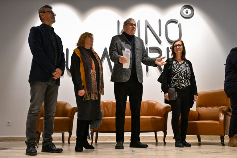 Zľava: Architekt Peter Štrpka, riaditeľka Útvaru ekonomiky a manažmentu Slovenského filmového ústavu Marta Šuleková, generálny riaditeľ Slovenského filmového ústavu Peter Dubecký a tlačová tajomníčka Slovenského filmového ústavu Simona Nôtová počas tlačovej konferencie spojenej s prehliadkou priestorov zrekonštruovaných priestorov Kina Lumière na Špitálskej ulici 4 v Bratislave. Bratislava, 18. január 2024. Foto: SITA
