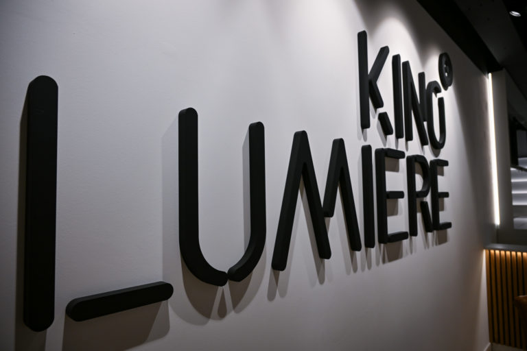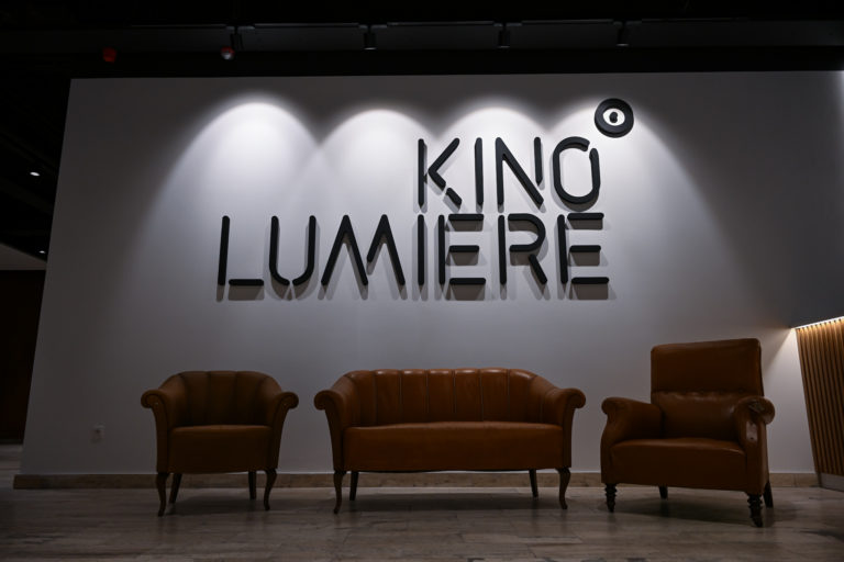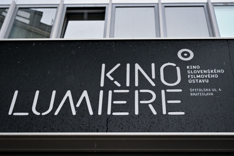 Tabuľa na priečelí budovy kina Slovenského filmového ústavu počas prehliadky zrekonštruovaných priestorov Kina Lumière na Špitálskej ulici 4 v Bratislave. Bratislava, 18. január 2024. Foto: SITA