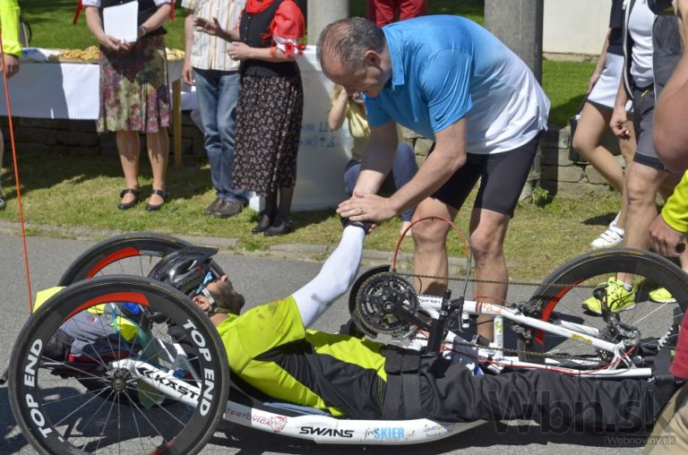 Prezident SR Andrej Kiska (vpravo hore) s účastníkom cyklopeletónu charitatívneho podujatia Cez Slovesko na bicykli. Nová Lesná, 5. jún 2015. Foto: SITA/Radoslav Maťaš