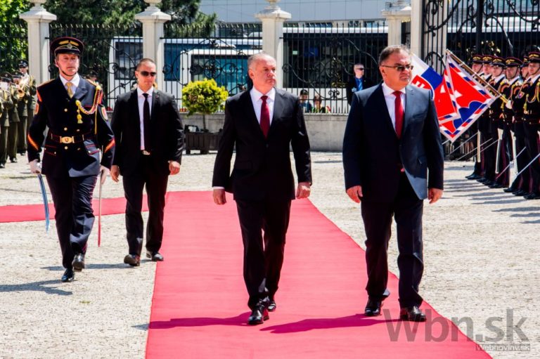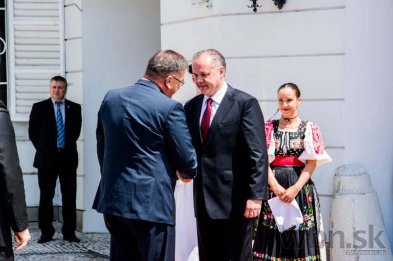 Sprava: Prezident SR Andrej Kiska a predsedajúci Predsedníctva Bosny a Hercegoviny Mladen Ivanić počas privítania v Prezidentskom paláci. Bratislava, 3. jún 2015. Foto: SITA/Igor Kollárovics