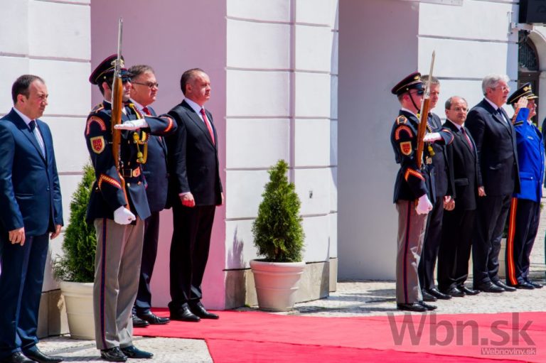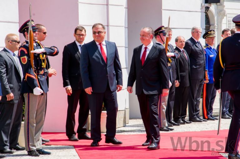 Sprava v strede: Predsedajúci Predsedníctva Bosny a Hercegoviny Mladen Ivanić a prezident SR Andrej Kiska počas privítania v Prezidentskom paláci. Bratislava, 3. jún 2015. Foto: SITA/Igor Kollárovics