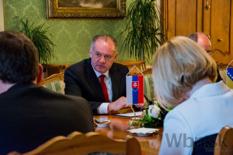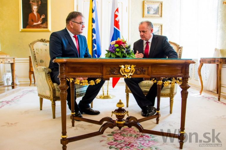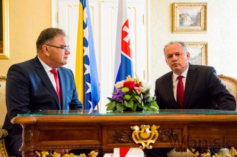 Prezident SR Andrej Kiska (v strede) počas rokovania s predsedajúcim Predsedníctva Bosny a Hercegoviny v Prezidentskom paláci. Bratislava, 3. jún 2015. Foto: SITA/Igor Kollárovics