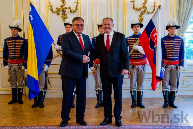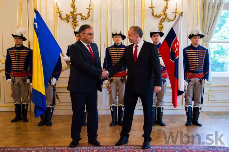 Zľava: Prezident SR Andrej Kiska a predsedajúci Predsedníctva Bosny a Hercegoviny Mladen Ivanić počas privítania v Prezidentskom paláci. Bratislava, 3. jún 2015. Foto: SITA/Igor Kollárovics