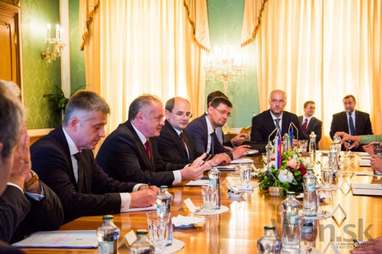 Prezident SR Andrej Kiska (tretí zľava) počas rokovania s predsedajúcim Predsedníctva Bosny a Hercegoviny v Prezidentskom paláci. Bratislava, 3. jún 2015. Foto: SITA/Igor Kollárovics