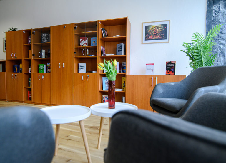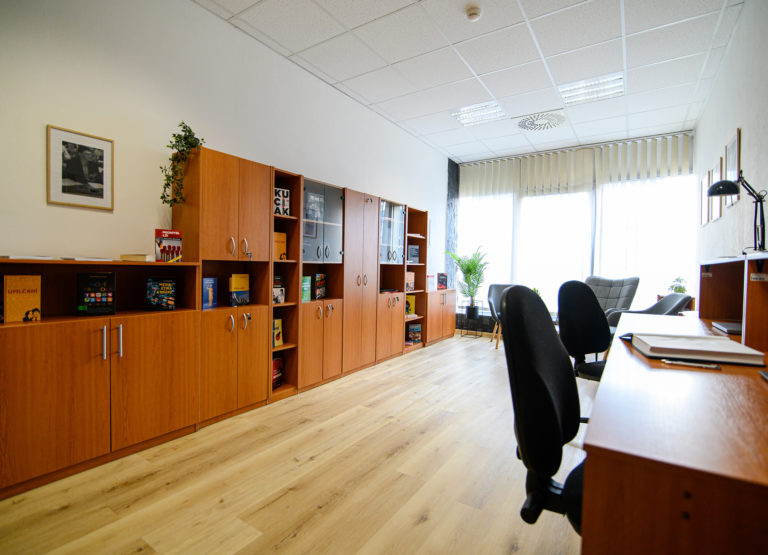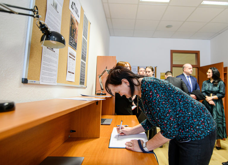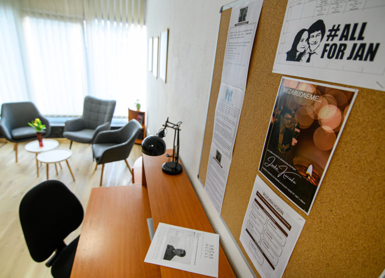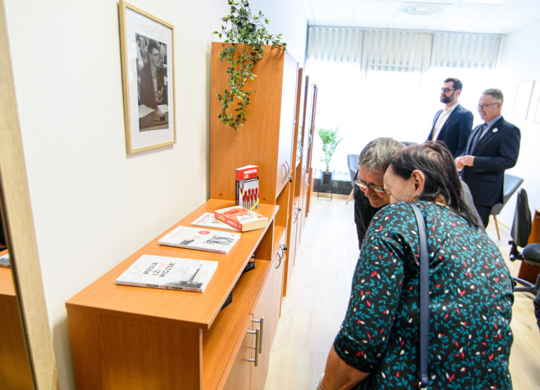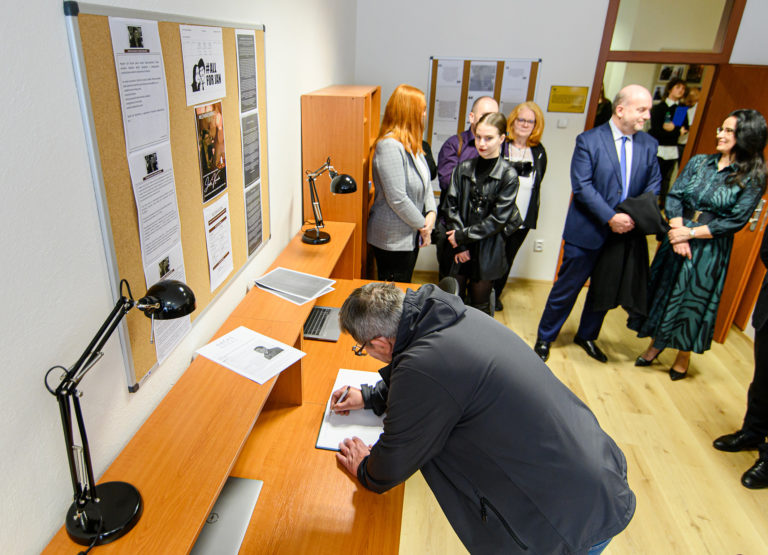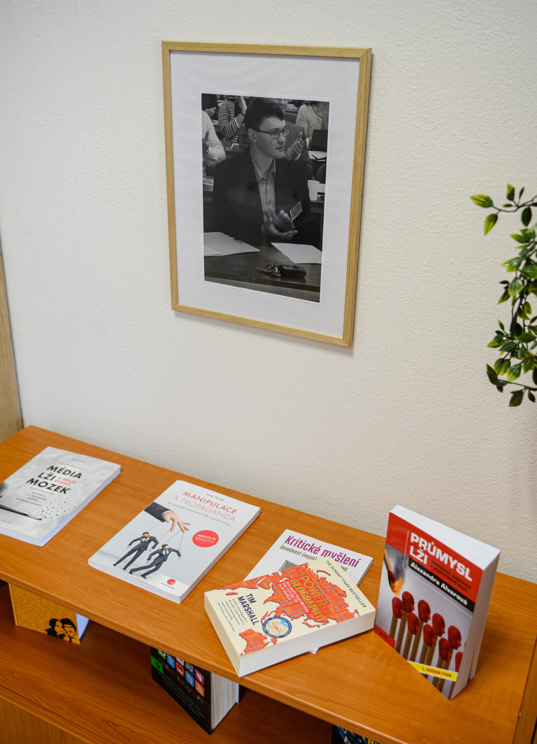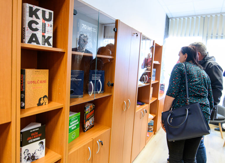 Novootvorená Knižnica Jána Kuciaka na Katedre žurnalistiky a nových médií Filozofickej fakulty Univerzity Konštantína Filozofa v Nitre, venovaná spomienke na zavraždeného investigatívneho novinára Jána Kuciaka, ktorý na katedre študoval a neskôr i pôsobil. Nitra, 28. február 2024. Foto: SITA/Martin Havran