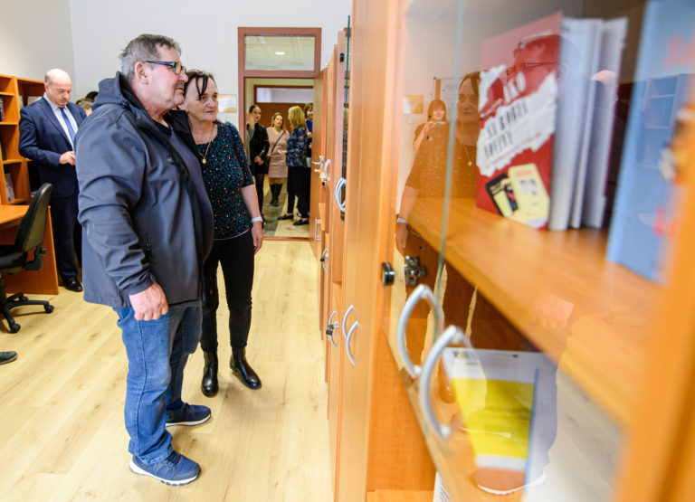 Zľava v popredí: Rodičia zavraždeného Jána Kuciaka otec Jozef Kuciak a matka Jana Kuciaková počas prehliadky novootvorenej Knižnice Jána Kuciaka na Katedre žurnalistiky a nových médií Filozofickej fakulty Univerzity Konštantína Filozofa v Nitre, venovanej spomienke na zavraždeného investigatívneho novinára Jána Kuciaka, ktorý na katedre študoval a neskôr i pôsobil. Nitra, 28. február 2024. Foto: SITA/Martin Havran