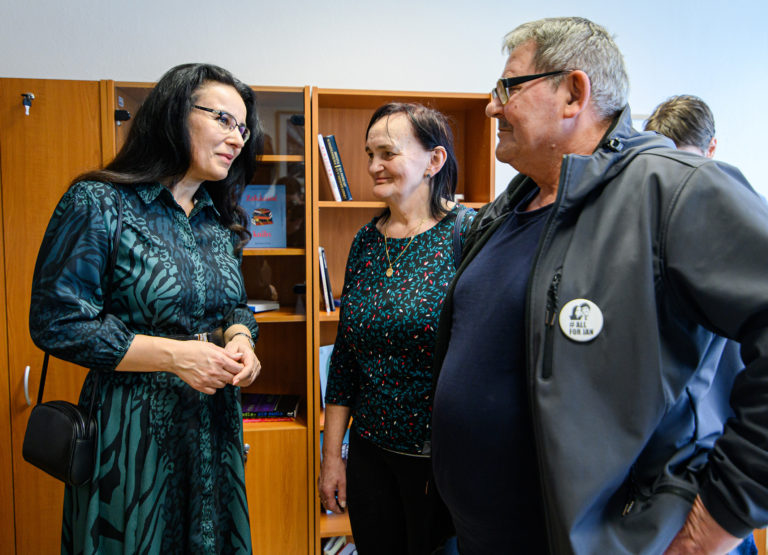 Rodiča zavraždeného Jána Kuciaka, sprava: Otec Jozef Kuciak a matka Jana Kuciaková počas prehliadky novootvorenej Knižnice Jána Kuciaka na Katedre žurnalistiky a nových médií Filozofickej fakulty Univerzity Konštantína Filozofa v Nitre, venovanej spomienke na zavraždeného investigatívneho novinára Jána Kuciaka, ktorý na katedre študoval a neskôr i pôsobil. Nitra, 28. február 2024. Foto: SITA/Martin Havran
