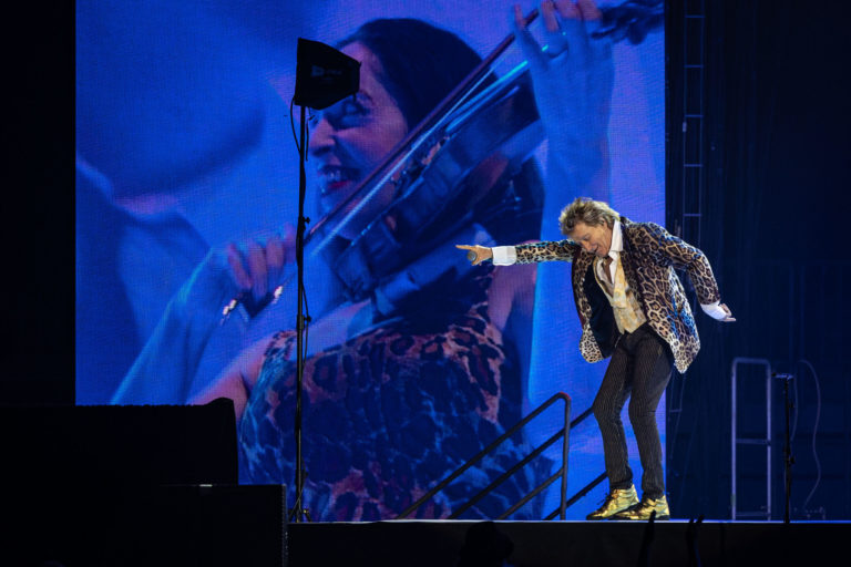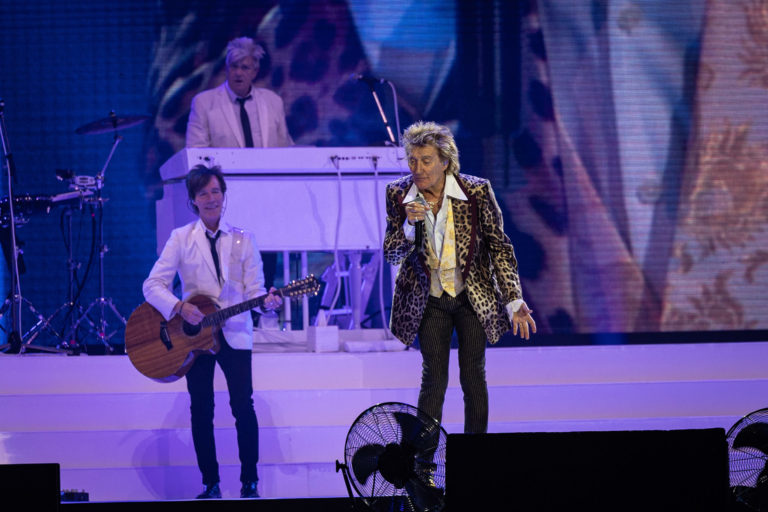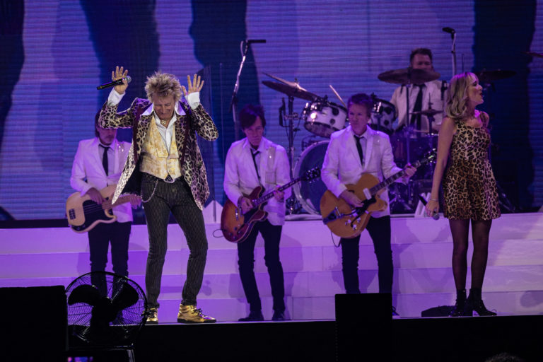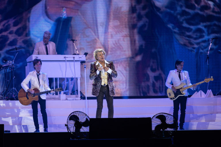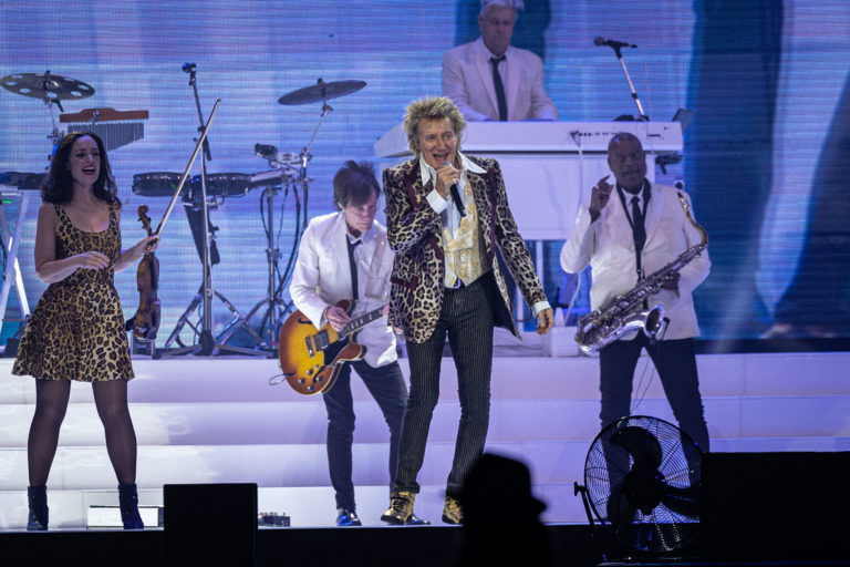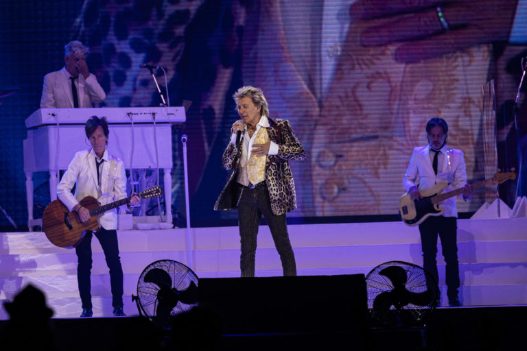 Anglický spevák Rod Stewart (druhý zľava) počas svojho vystúpenia v Bratislave. Bratislava, 22. máj 2024. Foto: SITA/Jana Birošová.