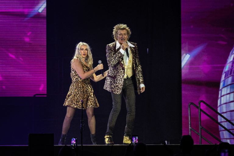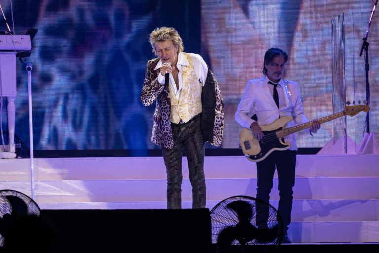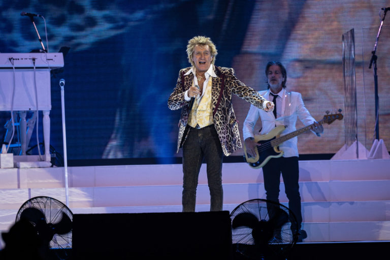 Anglický spevák Rod Stewart (vpravo) počas svojho vystúpenia v Bratislave. Bratislava, 22. máj 2024. Foto: SITA/Jana Birošová.