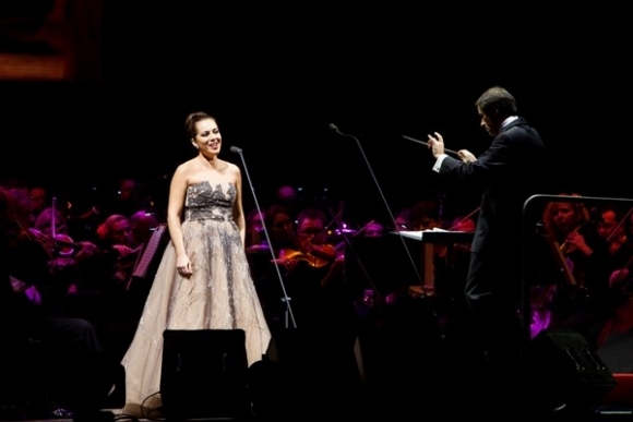 Slovenská operná speváčka Andrea Kučerová (uprostred vľavo) počas koncertu Andreu Bocelliho so symfonickým orchestrom na štadióne Ondreja Nepelu. Bratislava, 29. december 2013. Foto: SITA/Tomáš Bokor