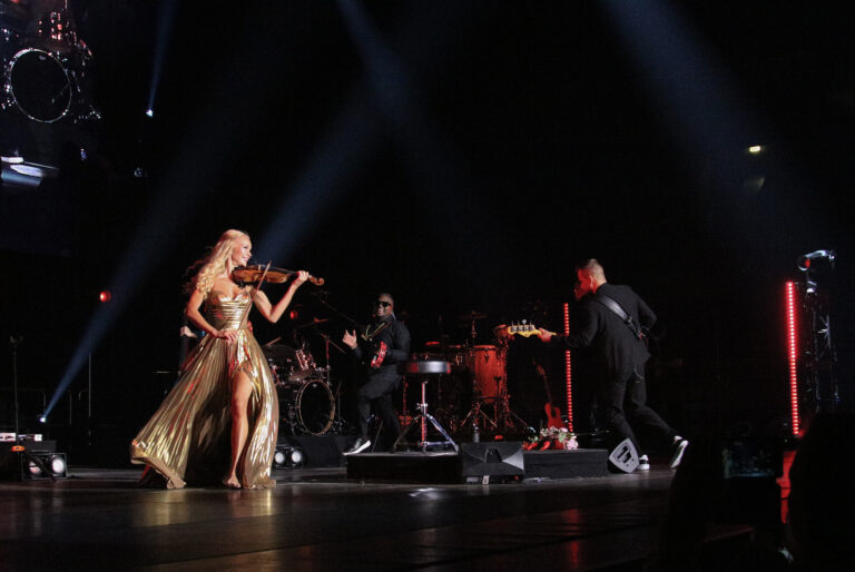 Zľava: Chorvátsky violončelista Stjepan Hauser a americká huslistka Caroline Campbell počas koncertu v rámci turné The Rebel Is Back! v bratislavskej Tipos Aréne. Bratislava, 14. november 2025. Foto: SITA/Andrea Mezeiová