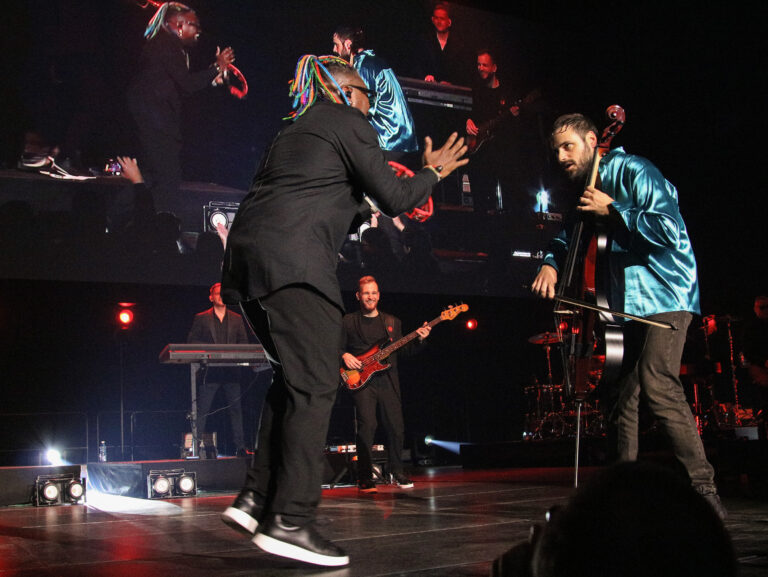 Chorvátsky violončelista Stjepan Hauser (vpravo) počas koncertu v rámci turné The Rebel Is Back! v bratislavskej Tipos Aréne. Bratislava, 14. november 2025. Foto: SITA/Andrea Mezeiová