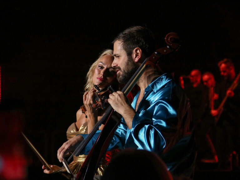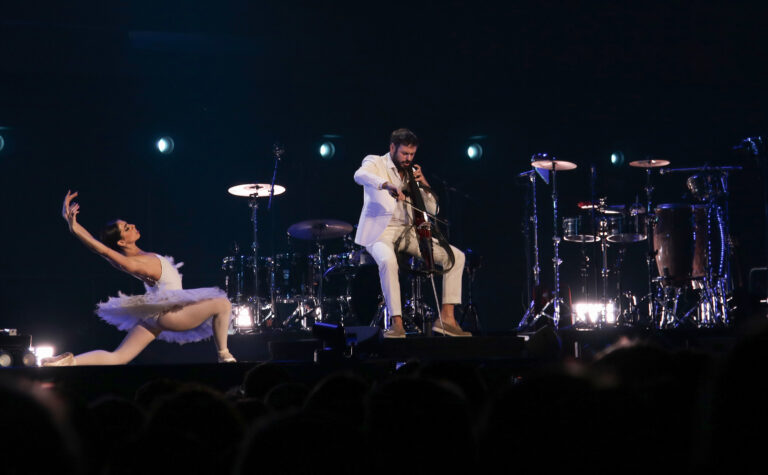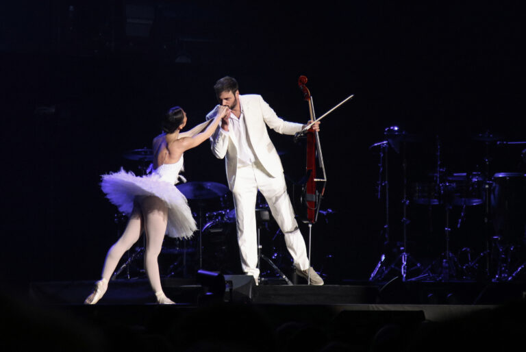 Sprava: Chorvátsky violončelista Stjepan Hauser a primabalerína Angelica Gismondo počas koncertu v rámci turné The Rebel Is Back! v bratislavskej Tipos Aréne. Bratislava, 14. november 2025. Foto: SITA/Andrea Mezeiová