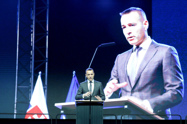 Minister škoslstva Tomáš Drucker v príhovore počas 1. pracovného kongresu Ministerstva investícií, regionálneho rozvoja a informatizácie (MIRRI) SR s komunálnymi lídrami v Aréne Poprad. Poprad, 11. december 2023. Foto: SITA/NR SR
