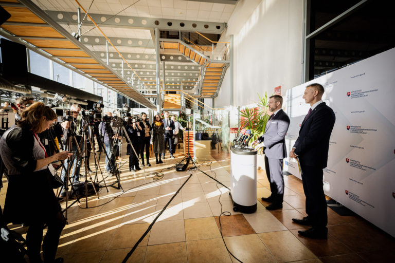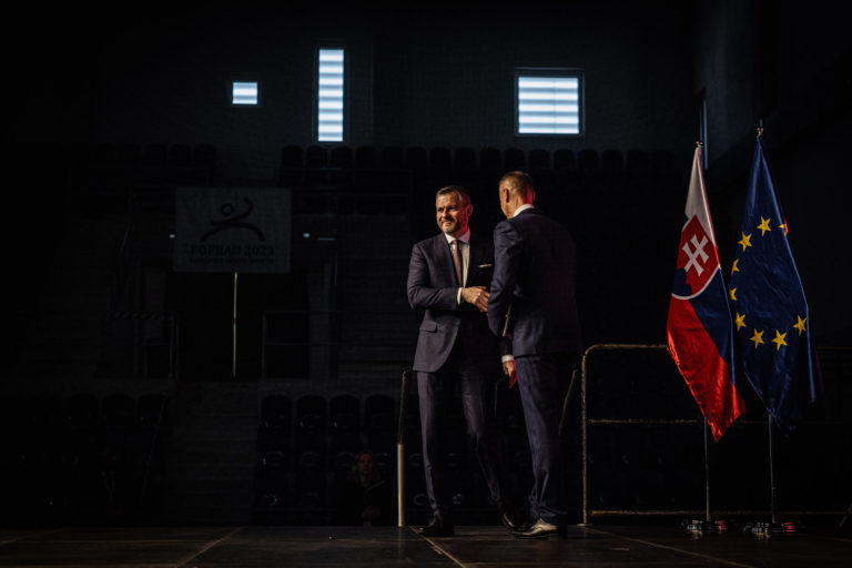 Zľava: Predseda Národnej rady SR Peter Pellegrini a minister investícií Richard Raši počas 1. pracovného kongresu Ministerstva investícií, regionálneho rozvoja a informatizácie (MIRRI) SR s komunálnymi lídrami v Aréne Poprad. Poprad, 11. december 2023. Foto: SITA/NR SR