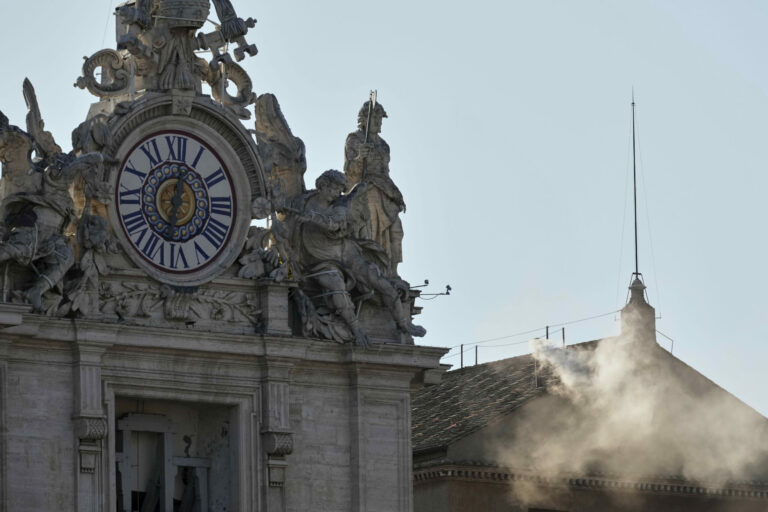 Biely dym sa valí z komína Sixtínskej kaplnky počas konkláve, na ktorom sa vo Vatikáne zvolil nový pápež. Foto: SITA/AP